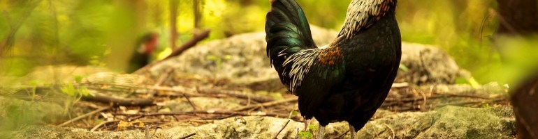 A wild chicken stands lookout near the Blacktip Island dump Thursday, watching volunteers set a trap for feral cats. Island officials worry the chickens and cats are colluding to take over the small Caribbean island. (photo courtesy of DIAC Images)