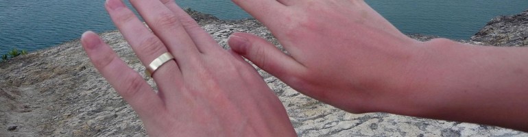 Blacktip Island resident Kay Valve shows off her wedding band, one of the rings found during last year’s inaugural Blacktip Island Lord of the Rings underwater wedding ring-finding contest. (photo courtesy of Steve and Jem Copley)